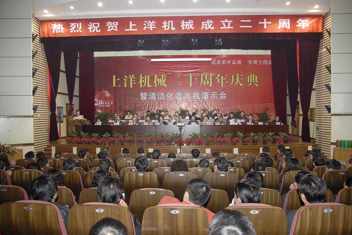 2008年,企業(yè)喜遷辦公大樓,上洋二十周年慶典隆重召開,來自社會各界領導及茶界專家、客戶共600余人參會。企業(yè)以“使清潔化更清潔,讓流水線流起來”為理念,引導茶加工產業(yè)發(fā)展新潮流,標志著公司在發(fā)展進程中邁出新的一步。