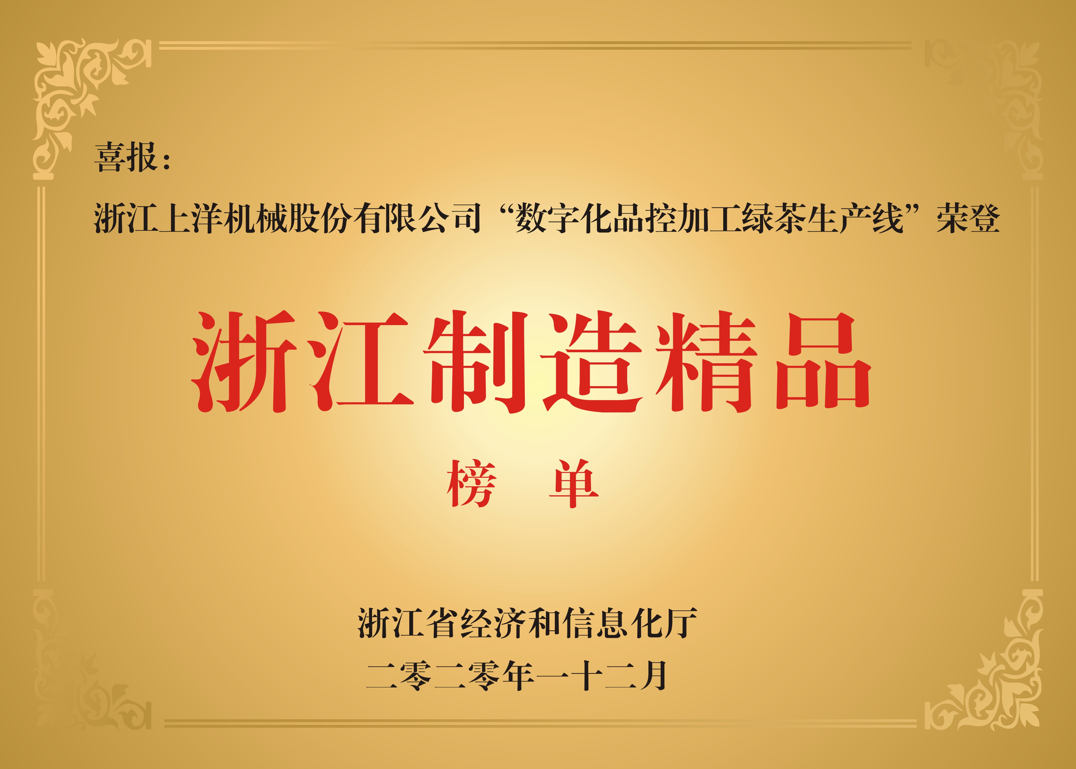 2020年, “6CRK-55茶葉揉捻機”獲“浙江制造品字標”認證榮譽,“數(shù)字化品控加工綠茶生產線”榮登“浙江制造精品”榜單。