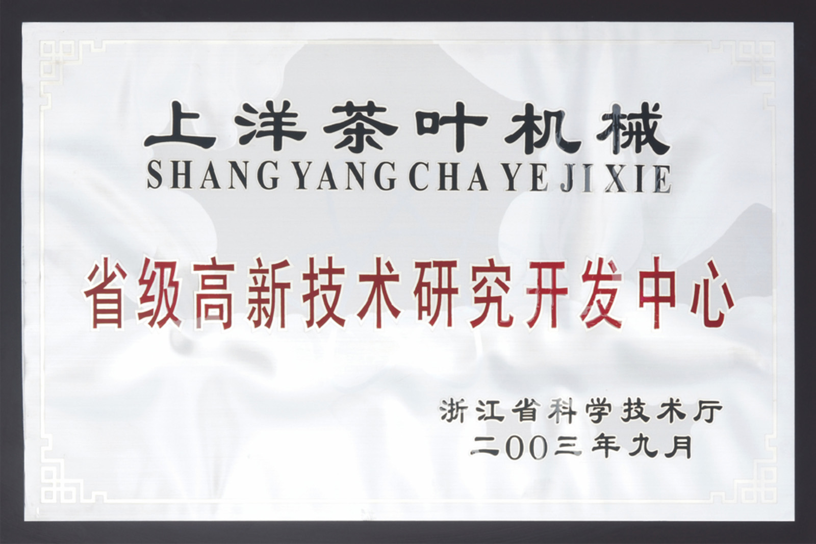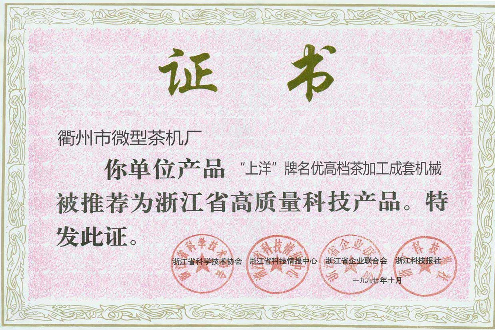 1997年10月,“上洋”牌名優(yōu)高檔茶加工成套機械被評為浙江省高質量科技產品。