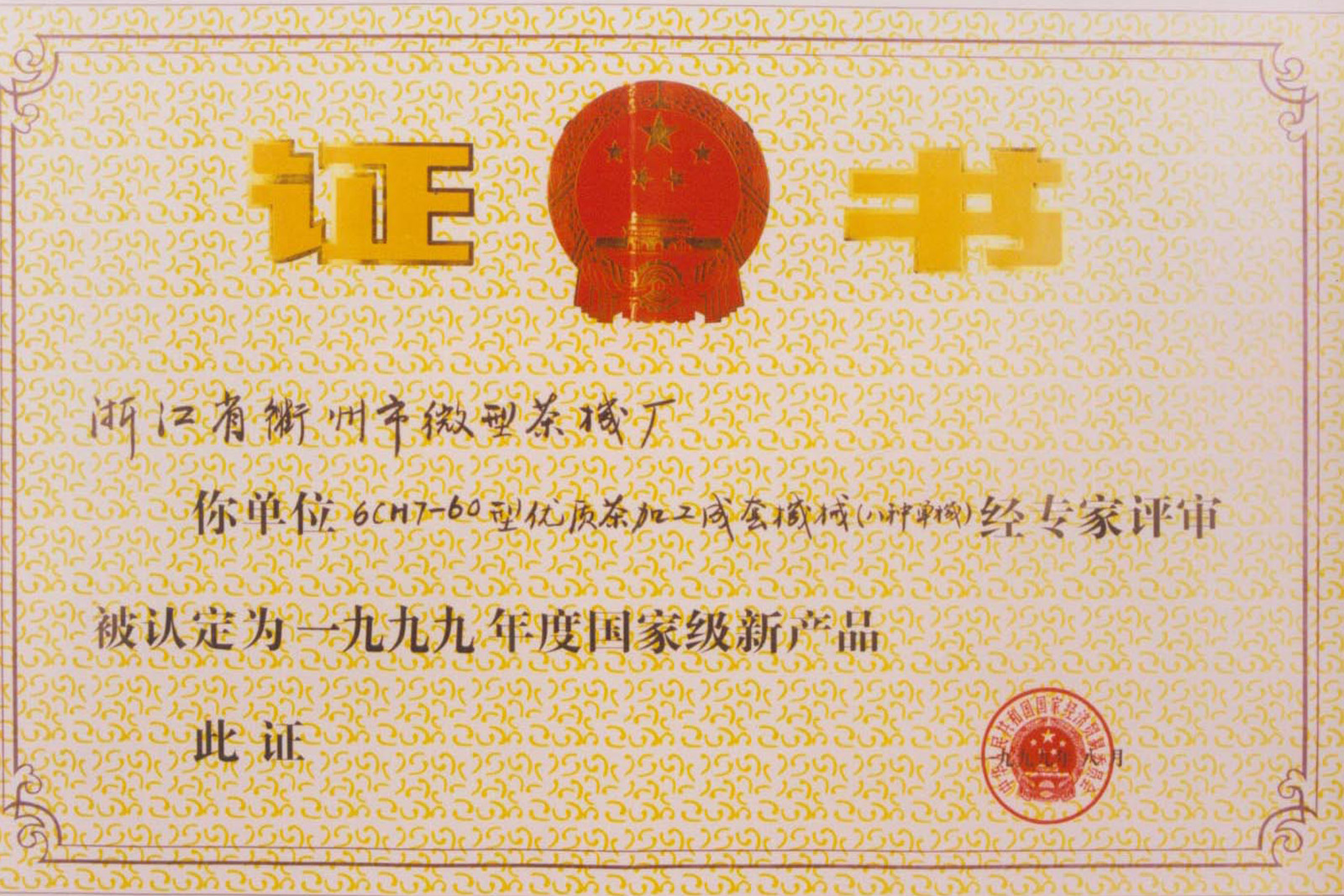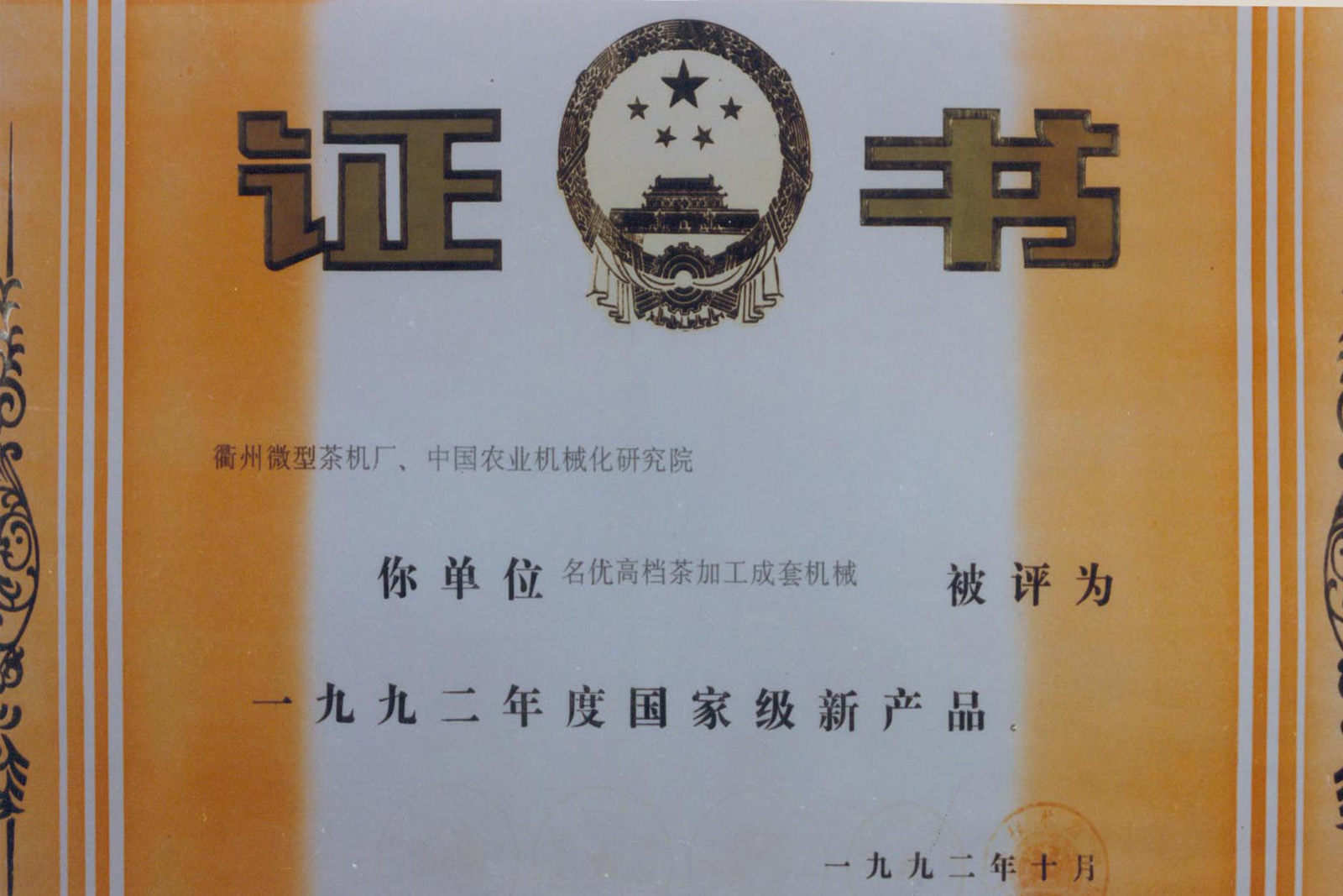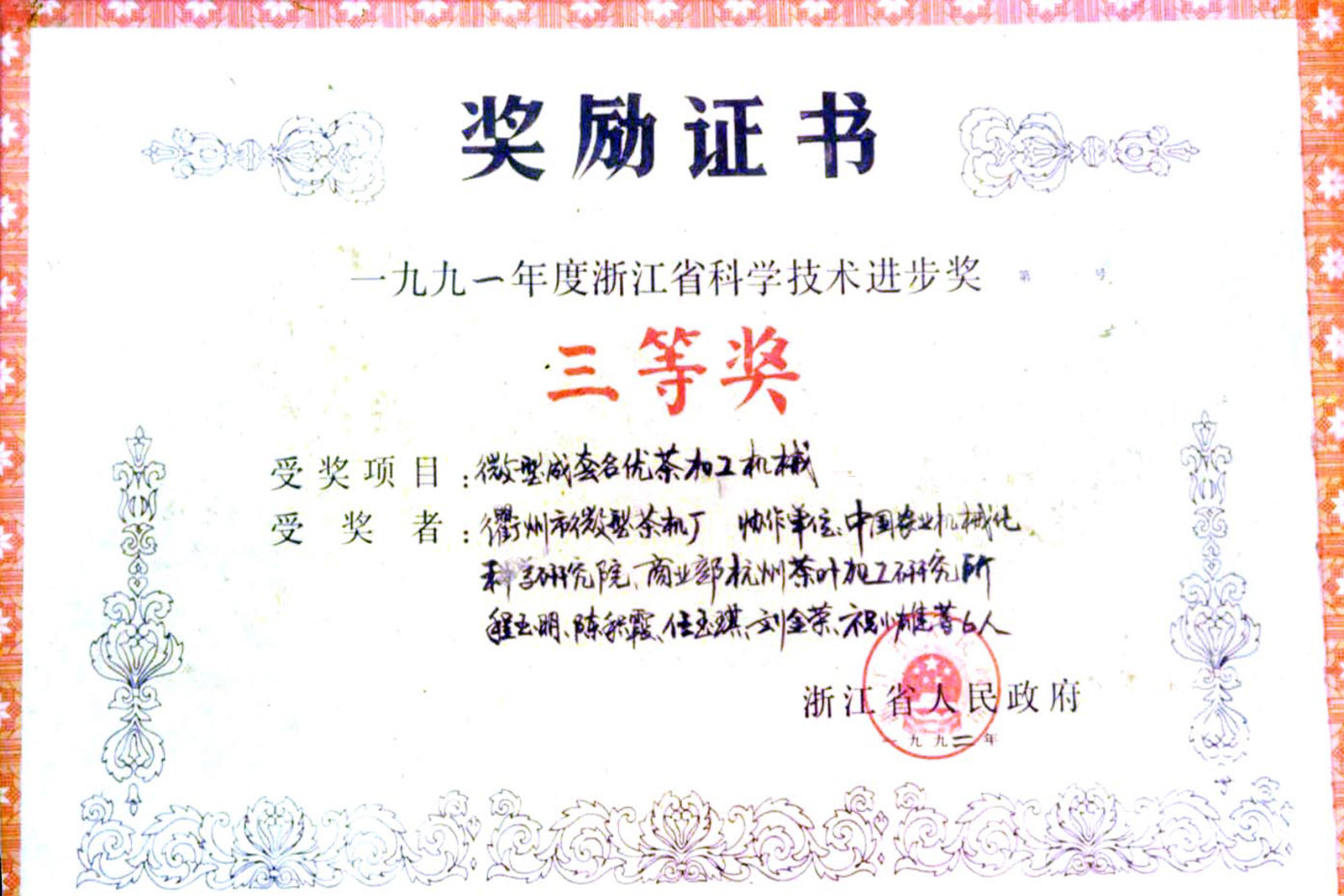 1991年,微型成套名優(yōu)茶加工機械通過省級新產品鑒定,這是國內最早通過省級鑒定的茶機產品,同年該產品分別榮獲浙江省科技進步三等獎。